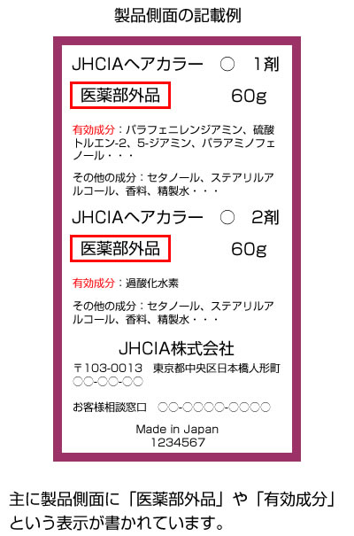 店頭には、ヘアカラー(医薬部外品)と染毛料(化粧品)が陳列されています。ヘアカラー(医薬部外品)には、「医薬部外品」や「有効成分」の文字が記載されていますので、その表示が見分けるポイントとなります。「医薬部外品」や「有効成分」の表示は、主に製品の側面で確認することができます。