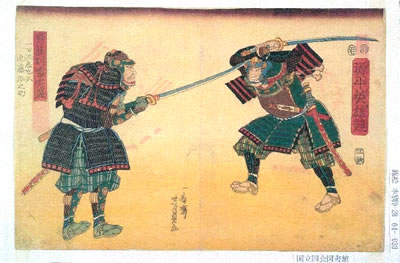 実盛が篠原の戦いで木曽義仲の武将の手塚光盛と老齢を押して戦う様子(国立国会図書館のウエッブサイトより転載)